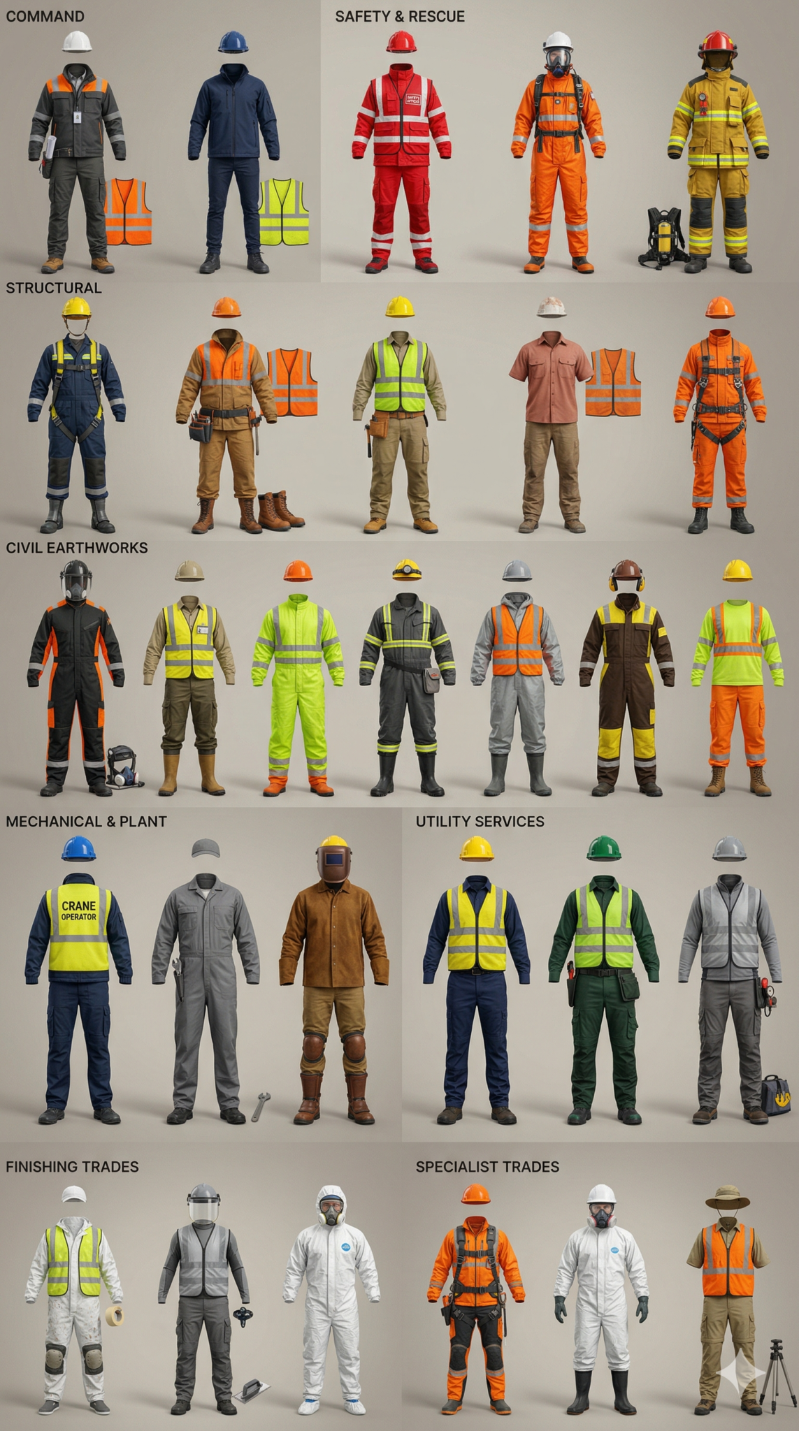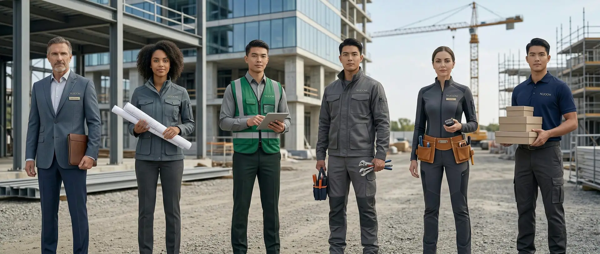 Uniforms for all roles — project managers, engineers, supervisors, workers, and support staff