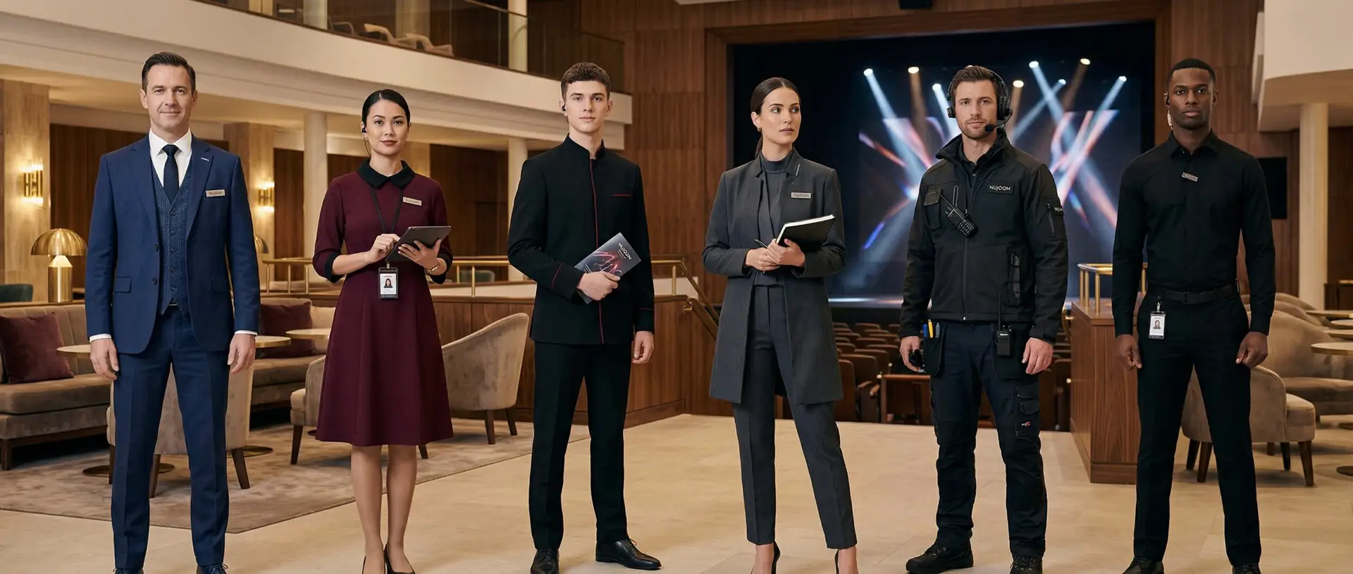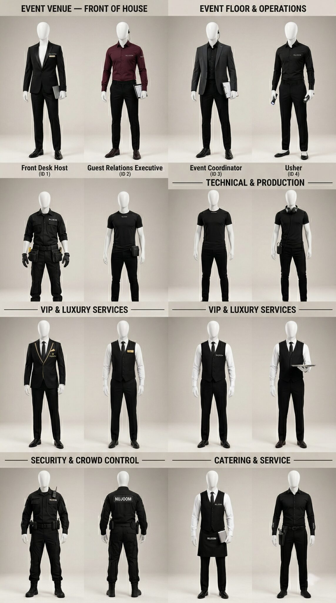 Uniforms for all roles — front-of-house staff, event coordinators, technical crew, service teams, and VIP management